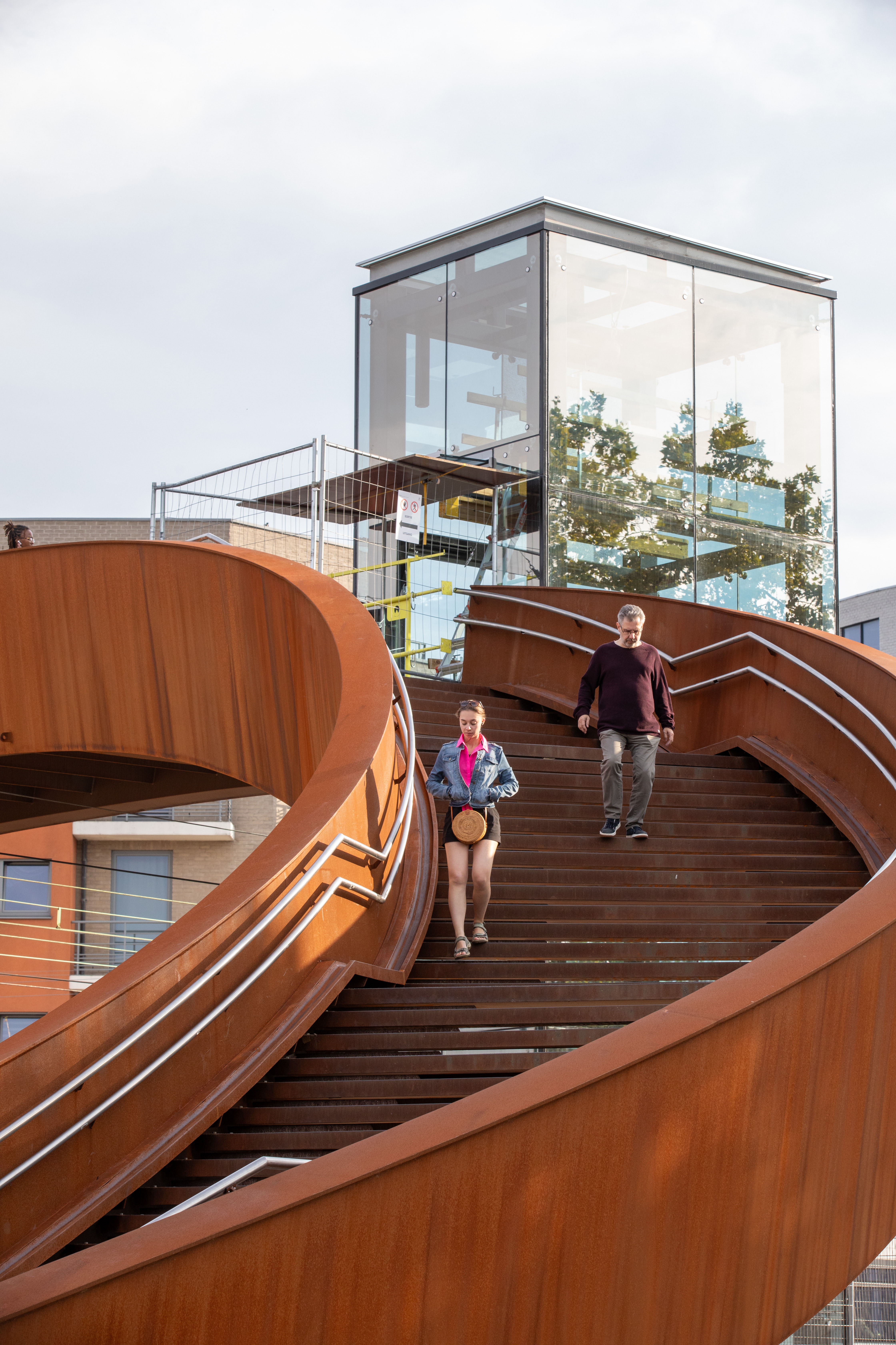 Structurally, the sculptural design of the passerelles is cleverly constructed: torsionally rigid load-bearing balustrades support the bridge deck and stair steps, the balustrades themselves rest on protruding beams that form one whole with the steelwork of the elevator shafts.
