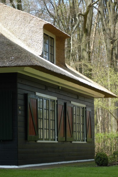 pitoresk huisje met rieten dak in bosrijke omgeving