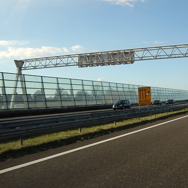 snelweg met matrixborden en glazen geluidscherm